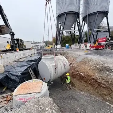 Im Zuge des Neubaus eines Salzsilos wurde ein neuer Staukanal (DN 2000) mit anschließender Neuerstellung der Asphaltoberfläche sowie Verlegung einer Schlitzrinne realisiert.