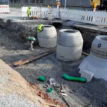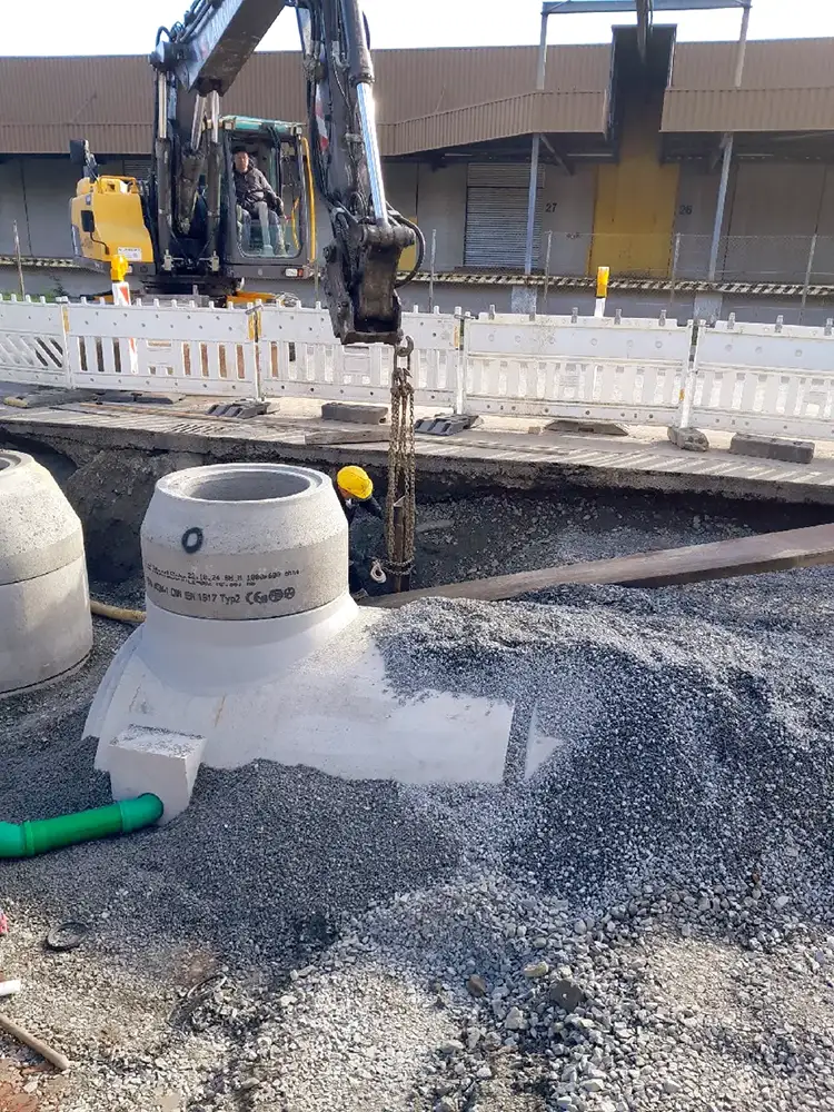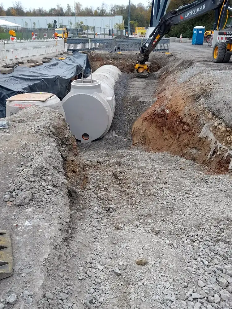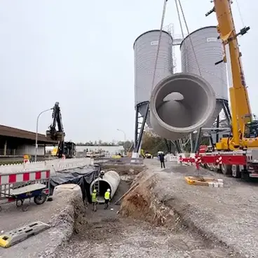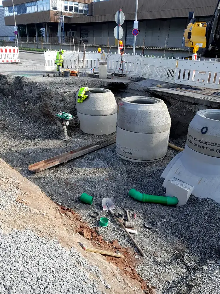 - Das Projekt umfasst einen Stauraumkanal DN 2000 mit 23 m³ Rückhaltevolumen.