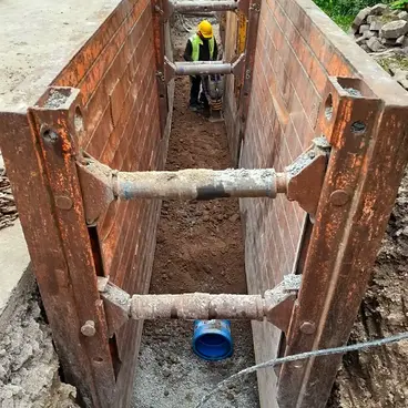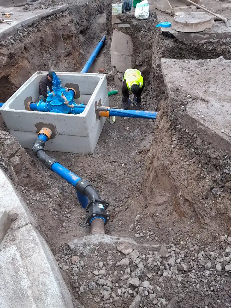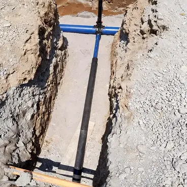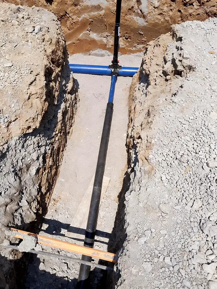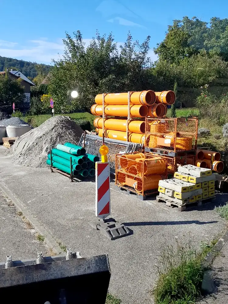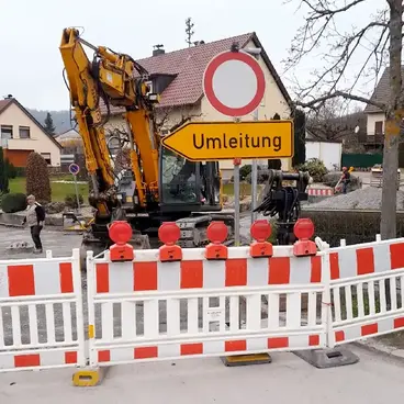 - Die Wasserversorgungsleitung wird abschnittsweise erneuert und mit modernen PE‑Rohrsystemen ausgeführt.