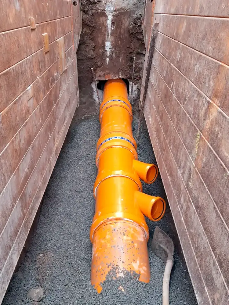 - Die vorhandenen Abwasserleitungen werden vollständig durch neue PP‑Kanäle ersetzt.